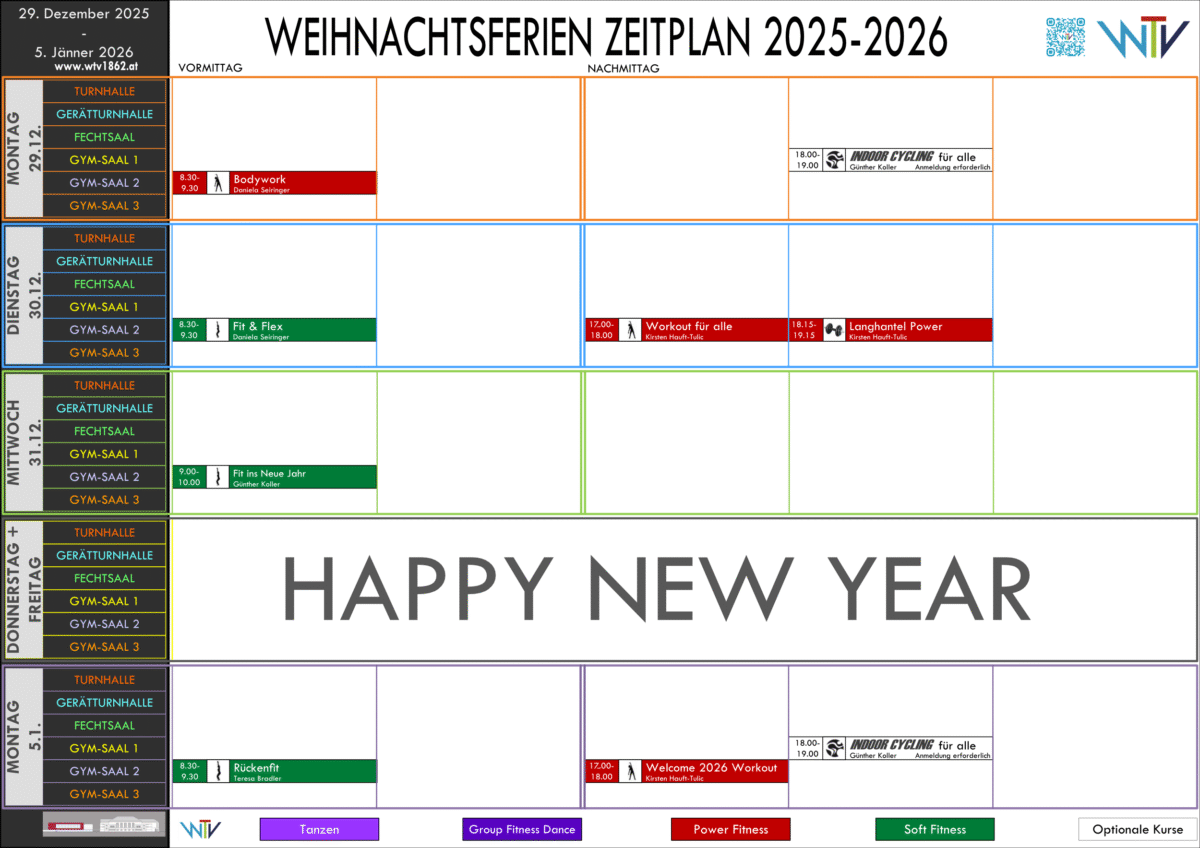 Von Fr, 19. bis Fr, 26.12.2025 ist Weihnachtspause und daher kein Turn- und Trainingsbetrieb!